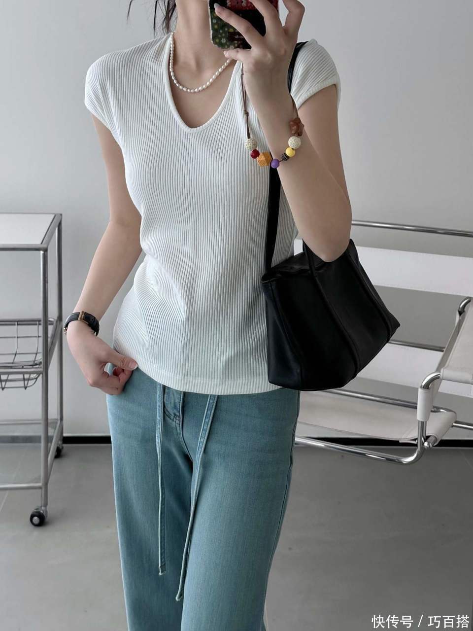 简单实用,日常外穿不容易撞衫还有格调,相较于传统圆领T恤来说,它更有设计感,七分袖长可以遮住麒麟臂,特别适合手臂粗的姐妹学习借鉴。